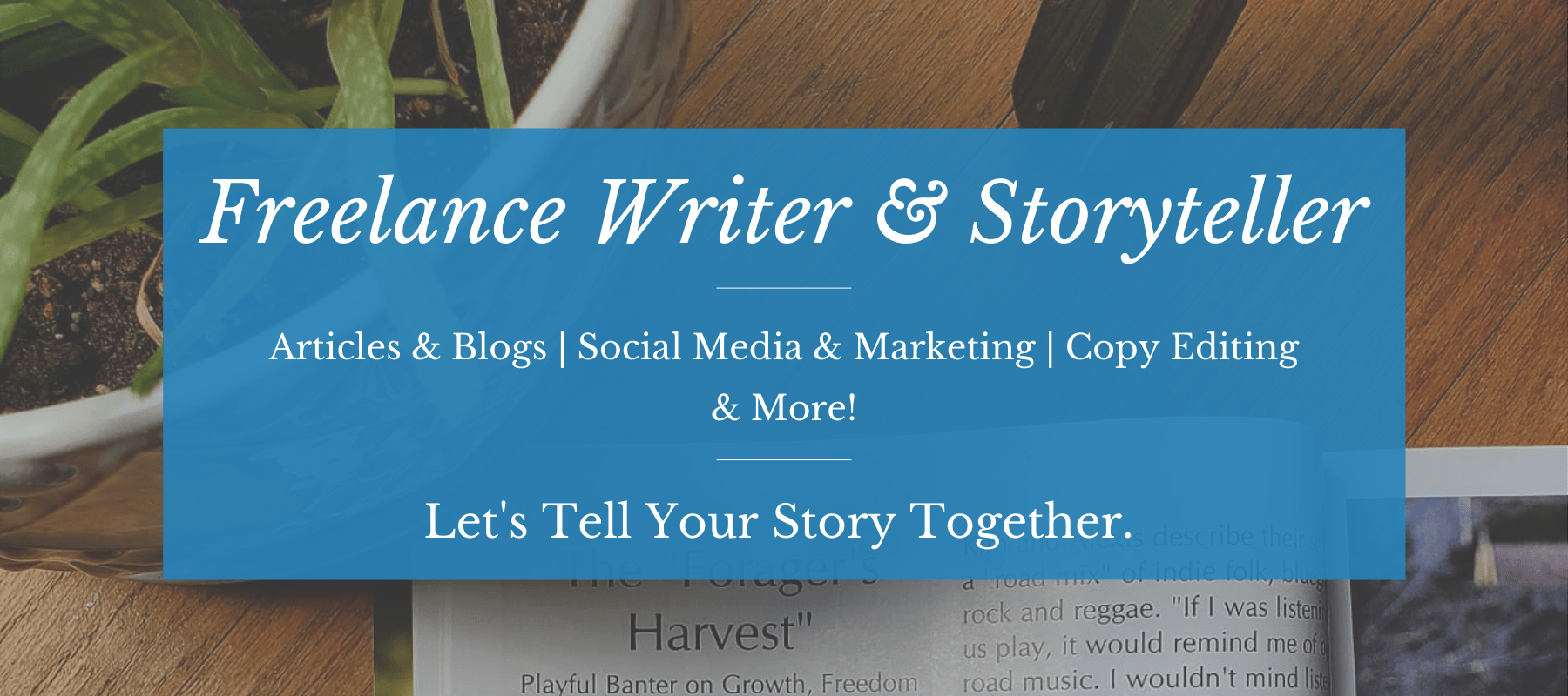 I also offer freelance writing services: blog posts, social media and website content, copy editing…and much more! Let’s tell your story together!