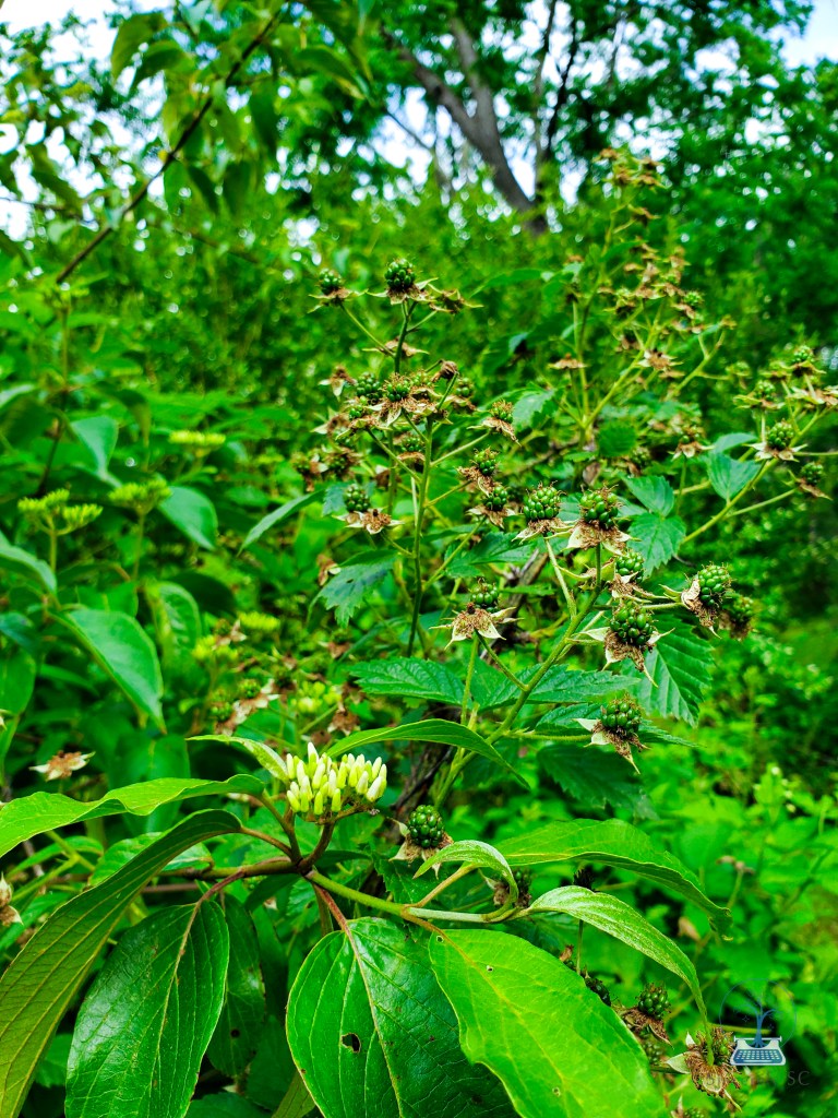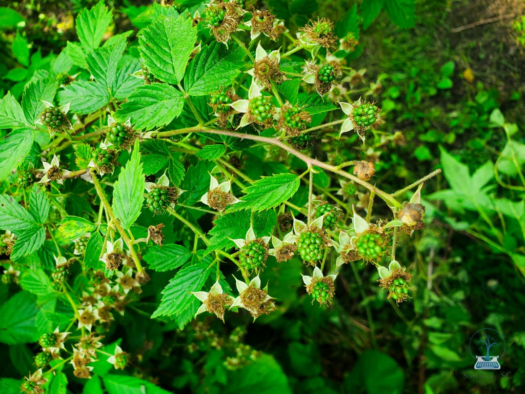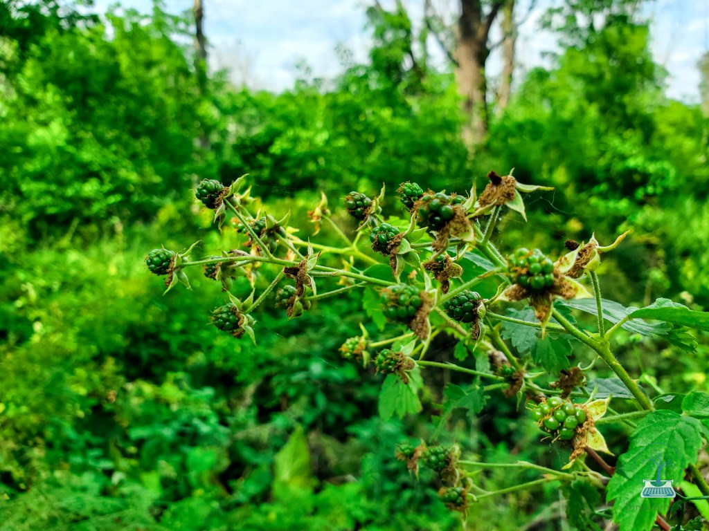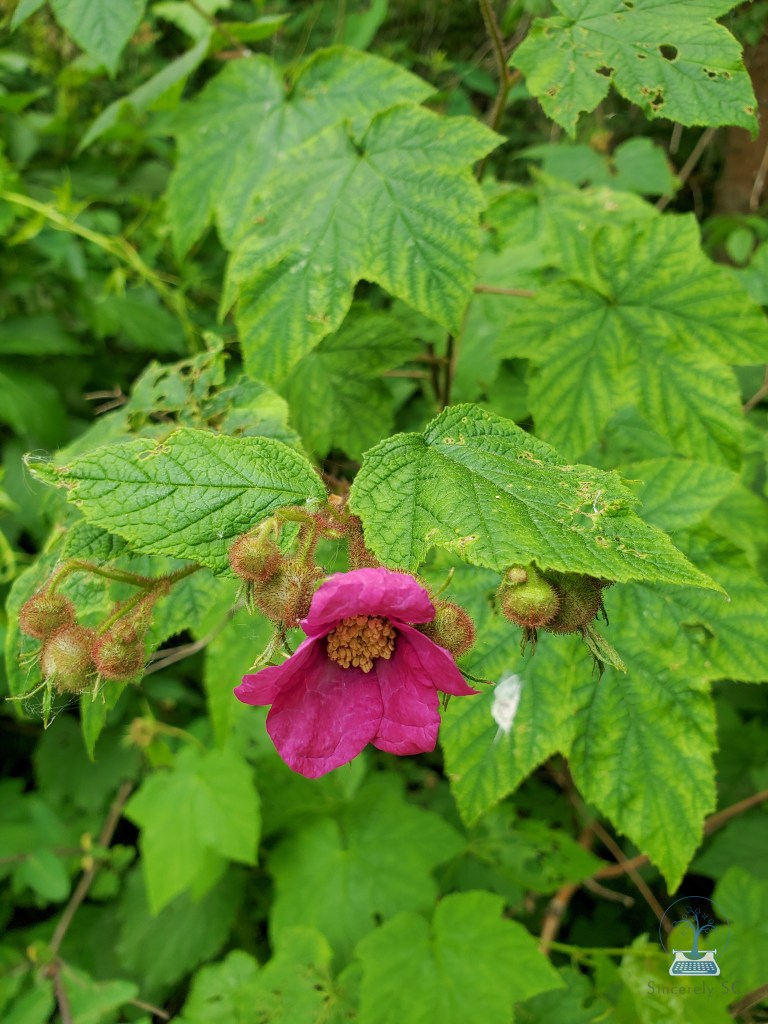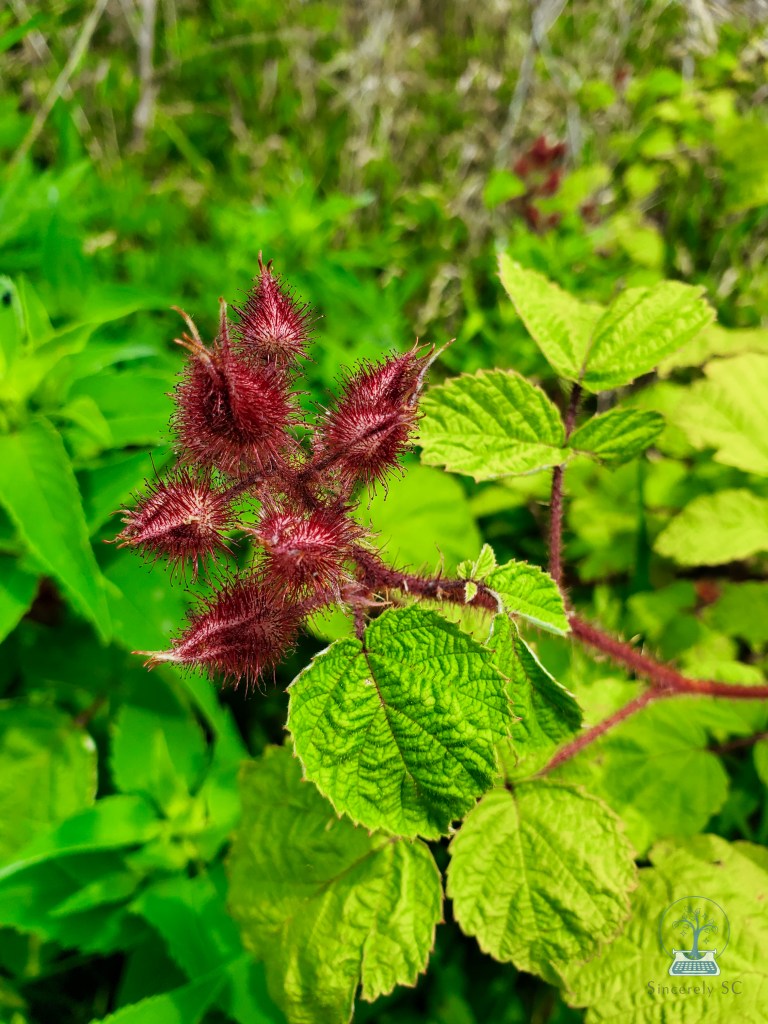 I’m also seeing signs of wineberries, a more common and just as delicious forageable food. These are invasive, while the blackberries are native. If you see wineberries, pick as many as you like, to help control the invasive population! These wild raspberries are so common, you’re bound to find them anywhere!