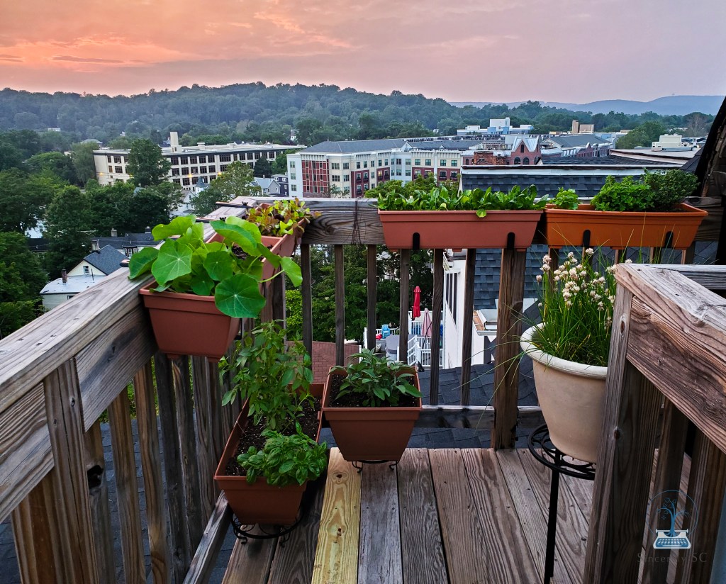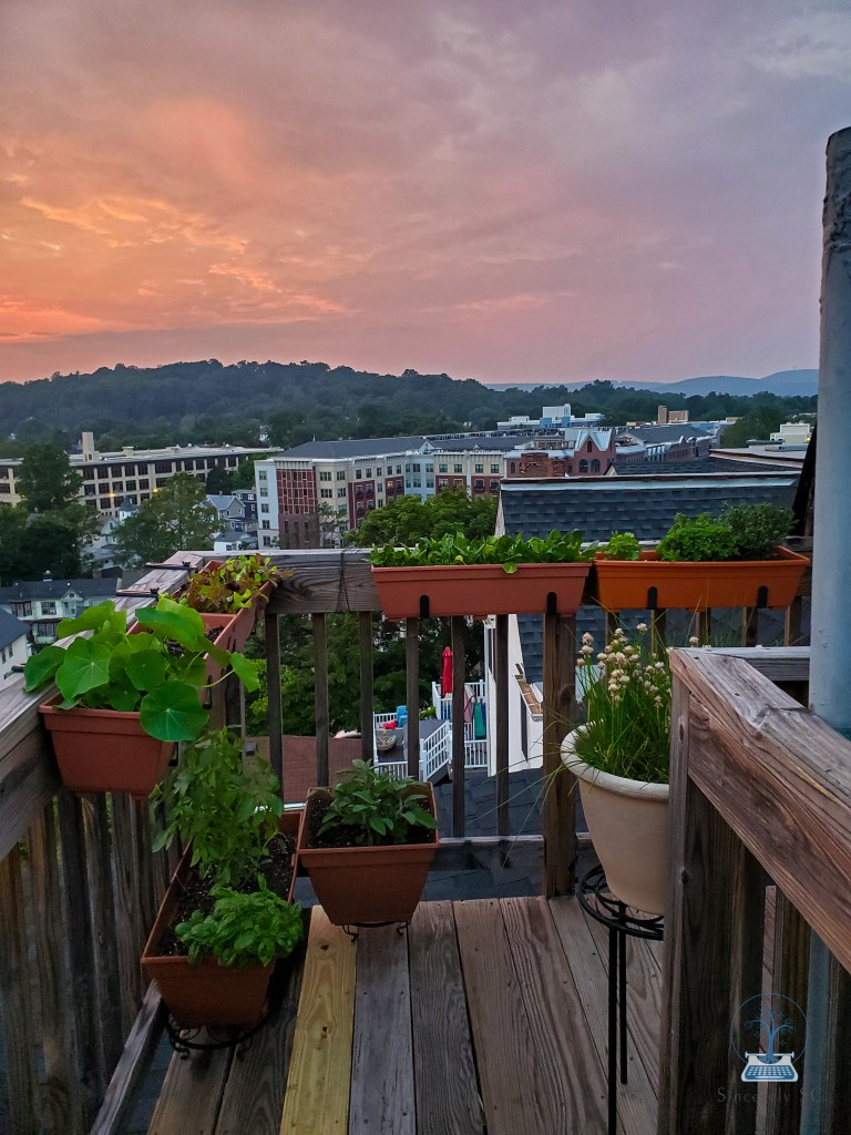 My balcony plants have grown so quickly, and they’re all thriving and nourishing us now — they’re probably very happy with the wonderful view! Inside, I tried growing lemon balm, rosemary, sage and oregano on the windowsills, but only the rosemary and oregano seem happy. Lemon balm spoke to me during a tea meditation at Well-Sweep Herb Farm last month, and I felt called to work with it. Maybe I’ll try to grow some in my larger plot…