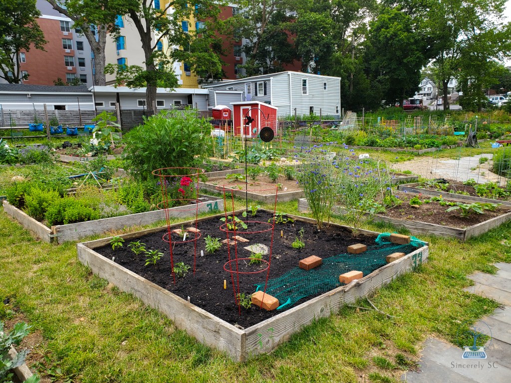 Already, only one week later, and the plants are looking happy and strong – grape tomatoes, frying peppers, zucchini, sage, rosemary, chamomile, beans, and the cornflowers from the previous owner, all growing, surrounded by the creative plots of other garden members. What excites me most about the community garden is just that — the community. So far, everyone I’ve met there has been wonderful, kind, knowledgeable, and generous. There is a lot of diversity, yet we’re all united by one thing: the plants. I’m excited to learn and be open to new ideas, spurred by this community of micro-farmers, trying to make our community and world a better place, one seed at a time.