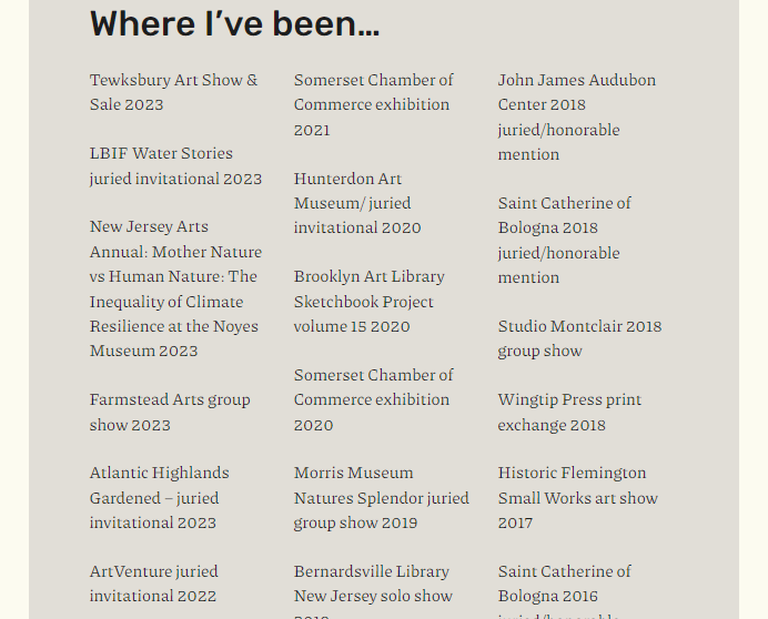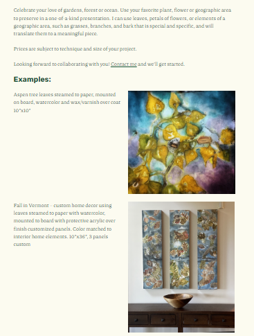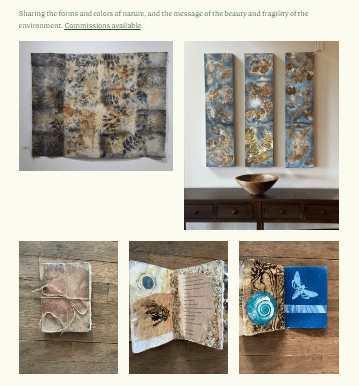 Cyanotype and eco-printing artist Lisa Madson wanted a website that would reflect her art style and values. Lisa’s mission is to share the forms and colors of nature, and the message of the beauty and fragility of the environment. Her art style is unique, combining cyanotype, embroidery, watercolor, and more. To capture Lisa’s earthy art style and connection to the natural world, I chose a site layout that was simple yet engaging, putting photos of Lisa’s work on full display. There are pages for Lisa’s artist statement, upcoming and past exhibitions, portfolio, and commissions. You can view the full site at https://natural-world-studio.com/.