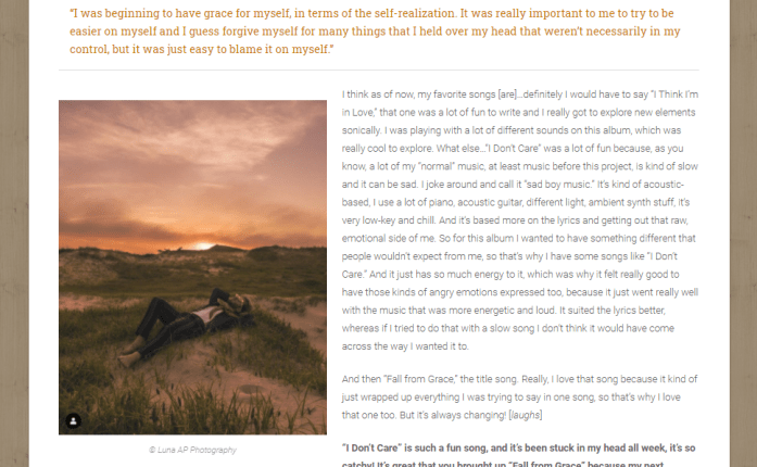 This two-part interview with indie-pop musician Drew Anton was conducted in video format, highlighting the release of Drew’s debut album, Fall from Grace. Transcriptions of the interview are available within the article.